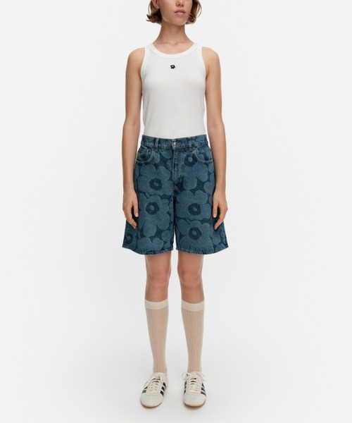 【Maridenim】 【テキスタイルデザイン:Maija Isola(マイヤ・イソラ)】 Unikko(ウニッコ):花 色の濃淡で「Unikko」柄を表現した、遊び心のあるデニムのショートパンツ。着丈がしっかりとあり、裾にやや広がりを持たせたバミューダタイプ。 ユニセックスな雰囲気で、合わせるトップスのデザインやサイズ感によって、スタイルの変化を楽しめます。夏はシンプルに、タンクトップとサンダル合わせがおすすめです。 ※品質表示は、Marimekko社の付けた洗濯表示を日本国内の基準に合わせ付け替えております。本国のタグはカットされておりますので、予めご了承ください。 ※断裁により商品ひとつずつの柄の出かたが異なるため、表示画像のディテールと多少異なるデザインのものが届く場合がございます。予めご了承ください。 モデル着用 サイズ:28inch 身長:175cm