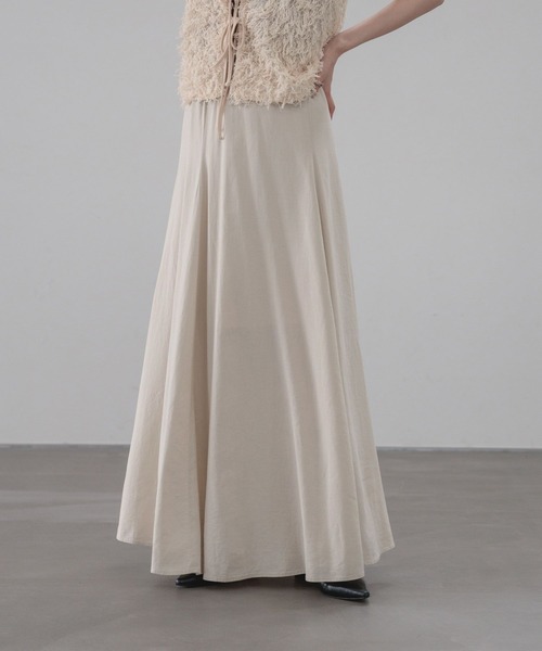 ■素材■ リネンレーヨンの混紡糸を使用した生地にビンテージ風の加工を施して雰囲気のある表情に仕上げました。 さらっとした風合いと程よい落ち感が特徴的です。 ■デザイン■ ナチュラルな風合いが魅力のリネン素材を使用したフレアスカート。 たっぷりとしたフレアシルエットが、動くたびに軽やかな印象を演出します。 シーズンムードを高め、デイリーからお出かけまで幅広く活躍する一枚です。 ■スタイリング■ 綺麗なフレアラインを引き立てる、コンパクトなトップス合わせたがおすすめ。 サンダル合わせで涼しげに、スニーカーでカジュアルダウンするのも◎