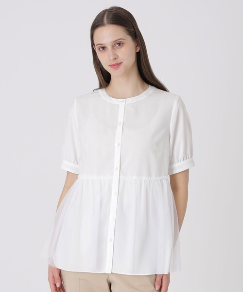 ◆カジュアルにもきれいめにも活躍するペプラムブラウス 【Design】 トレンド感あふれるペプラムシルエットの半袖ブラウス。 透け感のあるチュール素材をドッキングすることで、軽やかさの中に上品なニュアンスをプラスしました。 ブラウスと同色のチュールとスタンドカラーを組み合わせることで、甘くなり過ぎず大人の女性にも取り入れやすいデザインに仕上げています。 デニムパンツと合わせたカジュアルダウンスタイルはもちろん、タイトスカートとの上品なコーディネートもおすすめです。 幅広いシーンで活躍する一枚です。