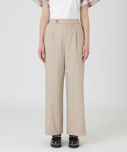 ◆きれいめに着こなせるデニムライク素材のワイドパンツ 【Design】 カジュアルなデザインながら、上品な表情の生地を使用することで綺麗めに着こなせる、デニムライクなワイドパンツ。 前ベルトや後ろポケットのフラップにあしらったメタルボタンがブルーレーベルらしいアクセントになっています。 シルエットは筒幅にこだわり、脚を美しく見せてくれるバランスに設計しました。