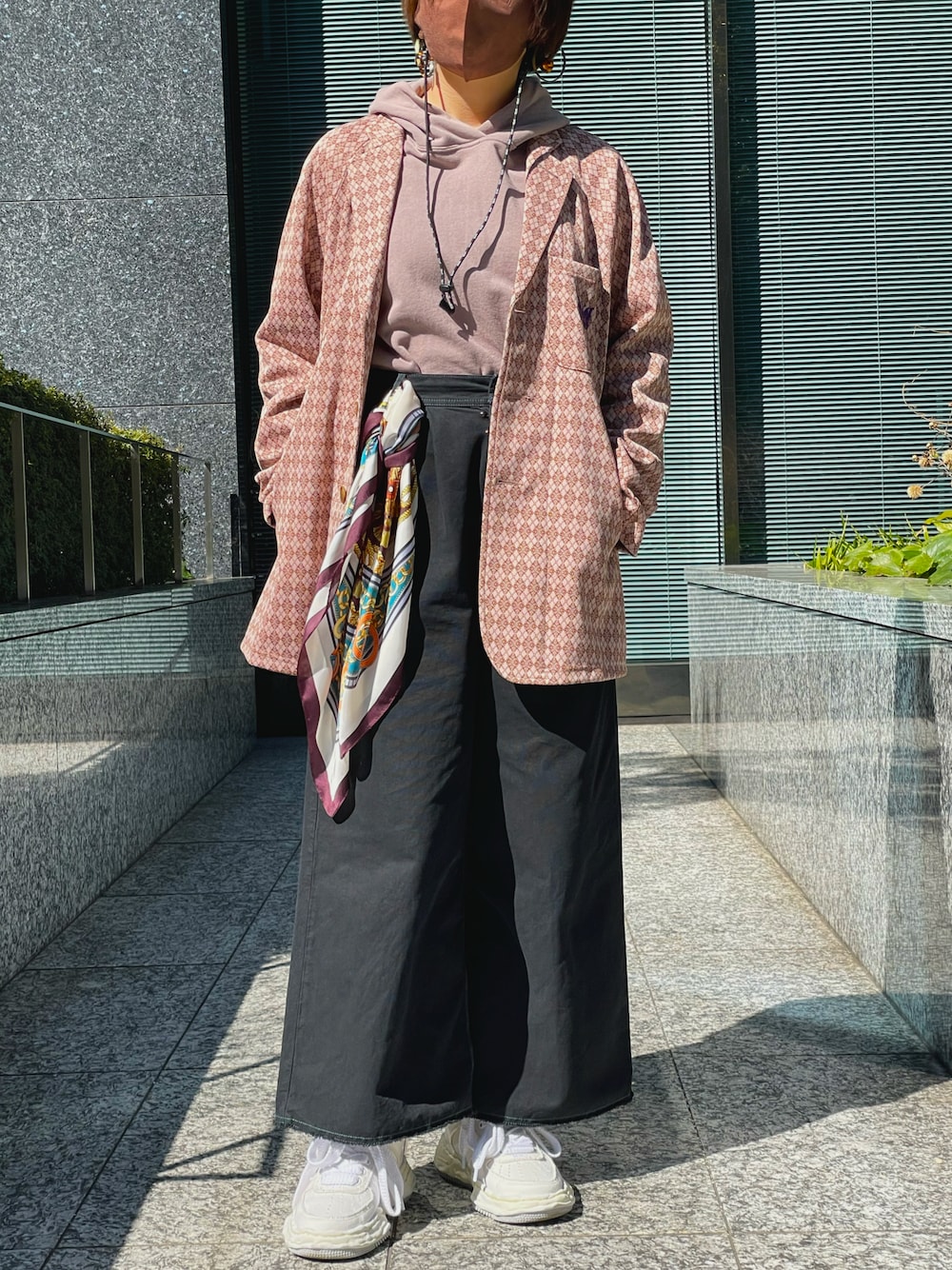 ジャケット#NEEDLS デニム#mm6 ジャケットとスニーカーを組み合わせたコーデをするために、色味の統一、小物でカジュアルから少し遠ざける、スニーカーだけど厚みのあるものにする、、等工夫しました!