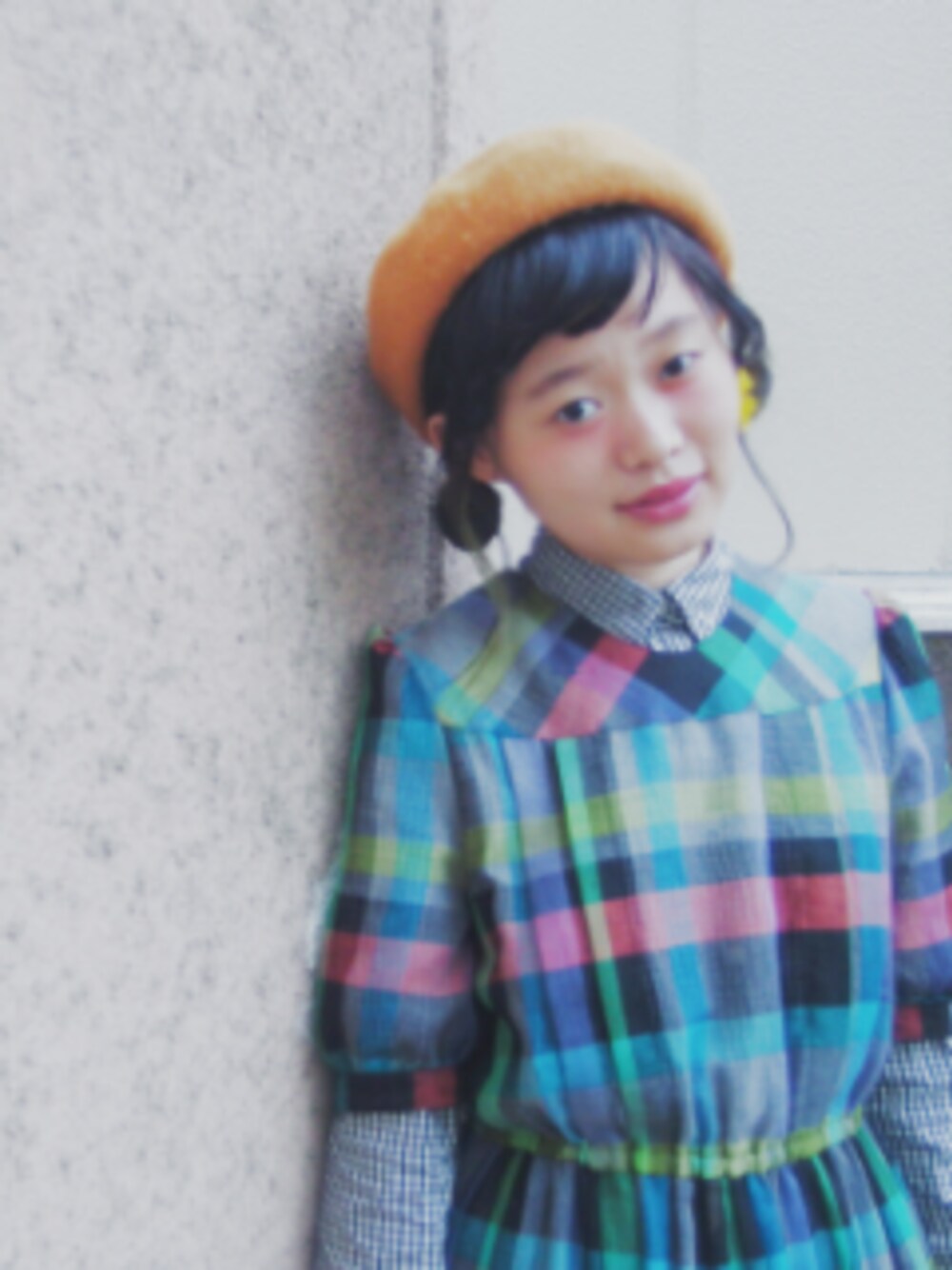 袖がかわいいクラシックなワンピース シャツをインして秋にも対応 。 ワンピース、古着 ギンガムシャツ、lowrysfarm ベレー帽、雑貨屋 イヤリング、ハンドメイド