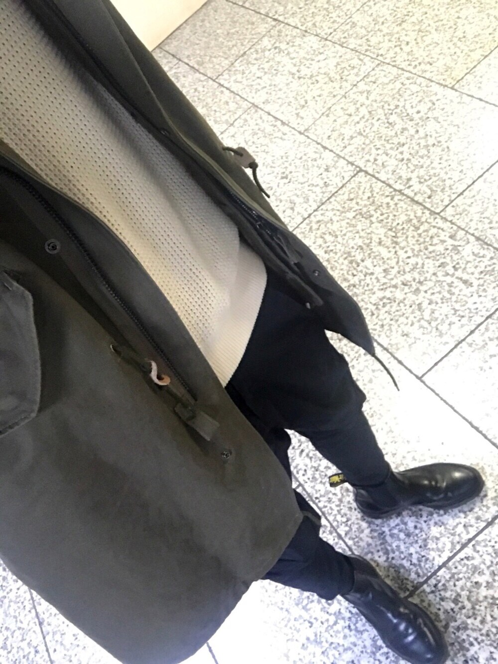ミリタリーを意識して、暗めの色にまとめようとしたのですが、色が渋すぎるとパッと見の印象が良くないように感じたので、白のセーターで明るさを少し出してバランスをとって見ました‼︎