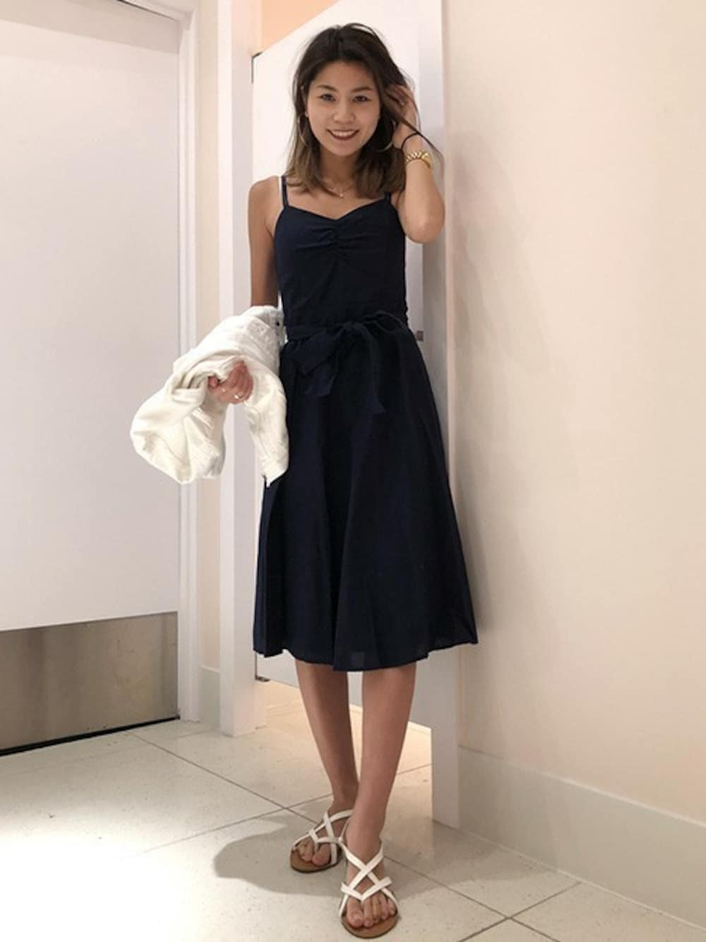 ネイビー×ホワイトで爽やかな色合いのコーディネートに仕上げました。 ワンピースにベルトが付いているのでウェストをスッキリ見せることができます。 フィット&フレア キャミソールワンピース(リネンコットン) (Gap/Color:ネイビー/¥7,900/ID:328126/着用サイズ:0) デニムジャケット (Gap/Color:ホワイト/¥6,900/ID:125775/着用サイズ:xxs) ストラップフラットサンダル (Gap/Color:ホワイト/¥4,900/ID:211503/着用サイズ:5) >Gap フラッグシップ原宿 http://mobile.gap.co.jp/stores/sp/store.php?shopId=37533953 >オンラインストアはこちら http://www.gap.co.jp/browse/subDivision.do?cid=5643