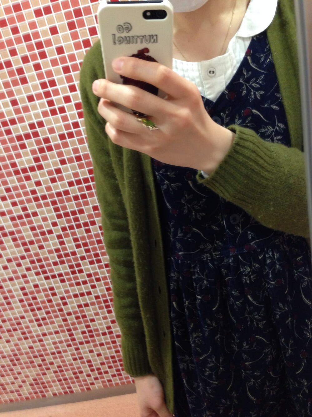 ▽苔?色カーディガン UNIQLO ▽チューリップ柄?のワンピース used ▽白シャツ SM2 ワンピースはコーデュロイ。