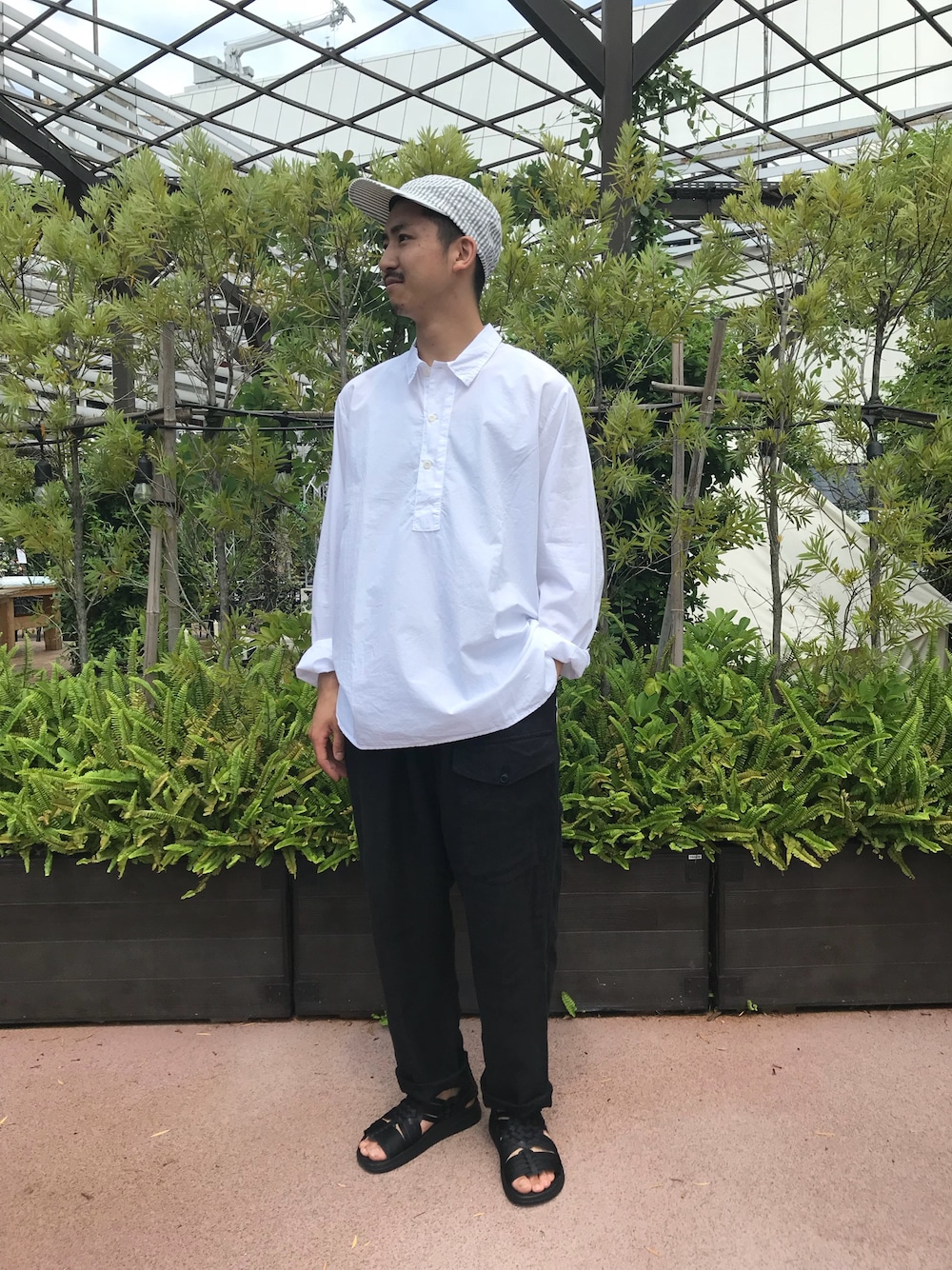 ゆったりとしたシルエットをモノトーンでまとめまとまりのあるスタイリングに。足元にはサンダルを合わせ軽やかな印象に。