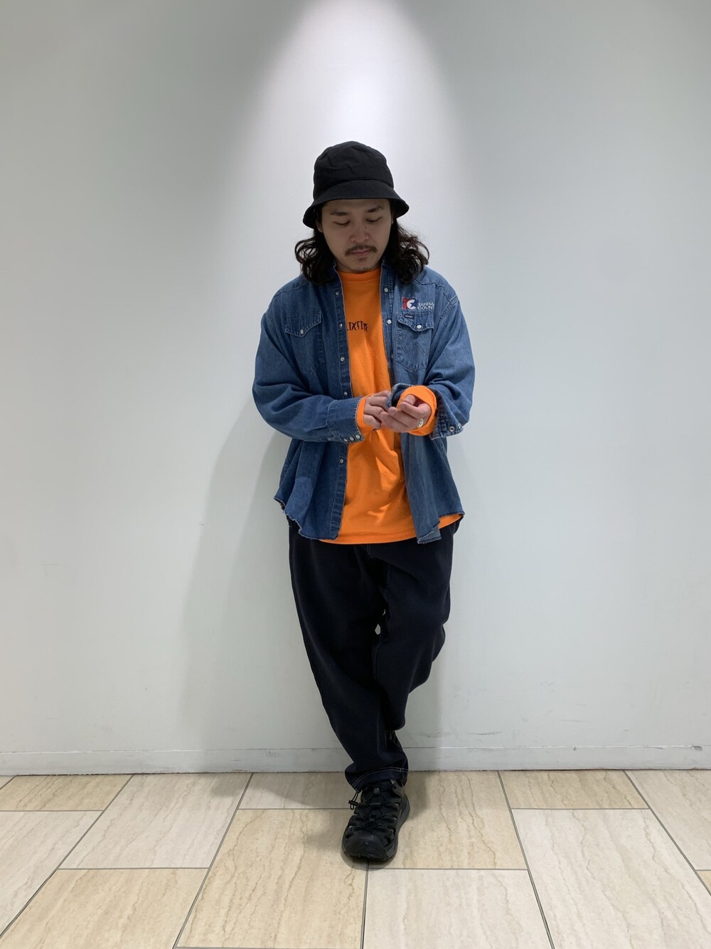 アメカジコーデ ブラックのパンツは実はスウェット素材です。