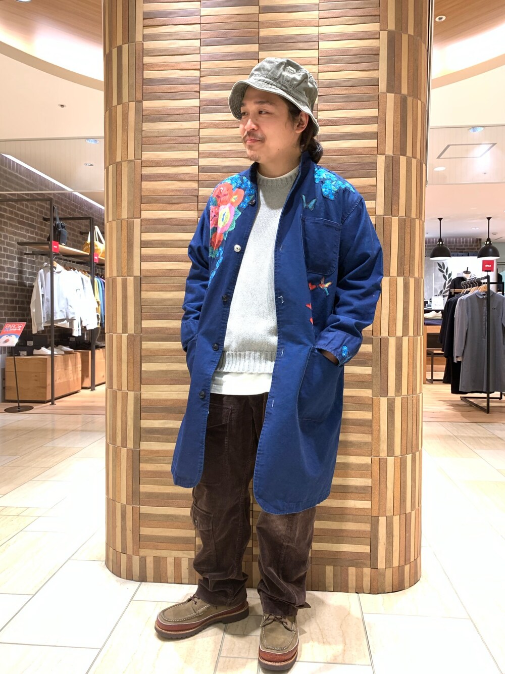 伊藤のステンカラーコート「BOHEMIANS/ボヘミアンズ 別注INDIGO OX GARDEN PATCH」を使ったコーディネート