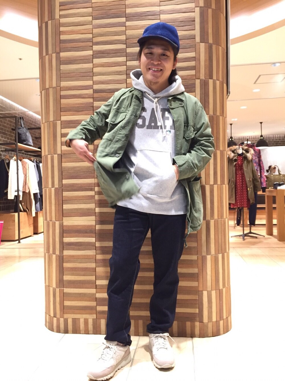 パーカーにミリタリージャッケットのボリューム感には 細身のパンツでバランスを