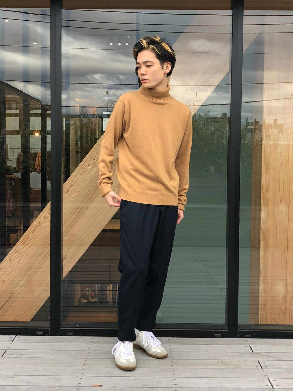 カシミヤライクな生地。 染め方にこだわった一品だとか。 このキャメルなら暗めのパンツで合わせます。