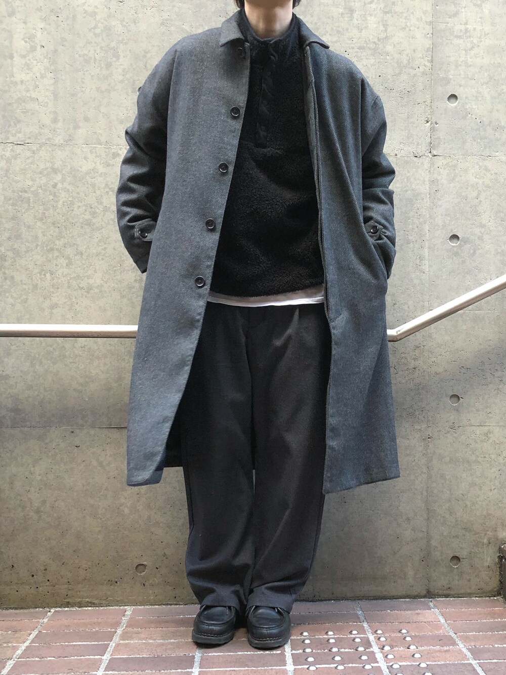 【coordinate】 「twツイードワイドパンツ」を使用したコーディネート。 コート、中に着ているフリース。 共にオーバーサイズ。 全体的にゆったりシルエットで。 黒でトーンを揃えることは間違いないですが、 チャコールグレーくらいの暗さのグレーでしたらこんな感じで色味を揃えてみても良いのではないでしょうか。
