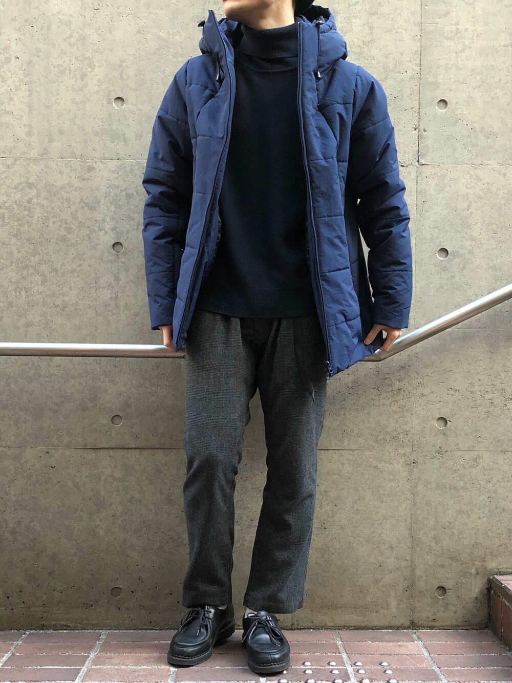 【coordinate】 「フードパフジャケット」を使用したコーディネート。 中には薄手のタートルニット、パンツはグレンチェックと他のアイテムは上品に。 ボリュームのあるジャケットも合わせるアイテム次第で綺麗にまとまります。