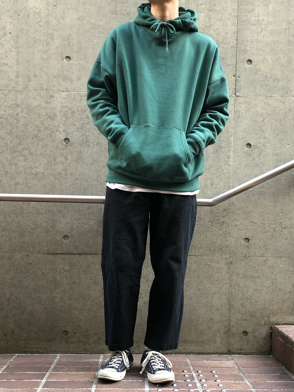 【koe】TC裏起毛ビックシルエットフーディーを使用したコーディネート このグリーン凄い良い。お気に入り。 とりあえず黒、黒合わせで👍 いつもご覧頂きありがとうございます🙏
