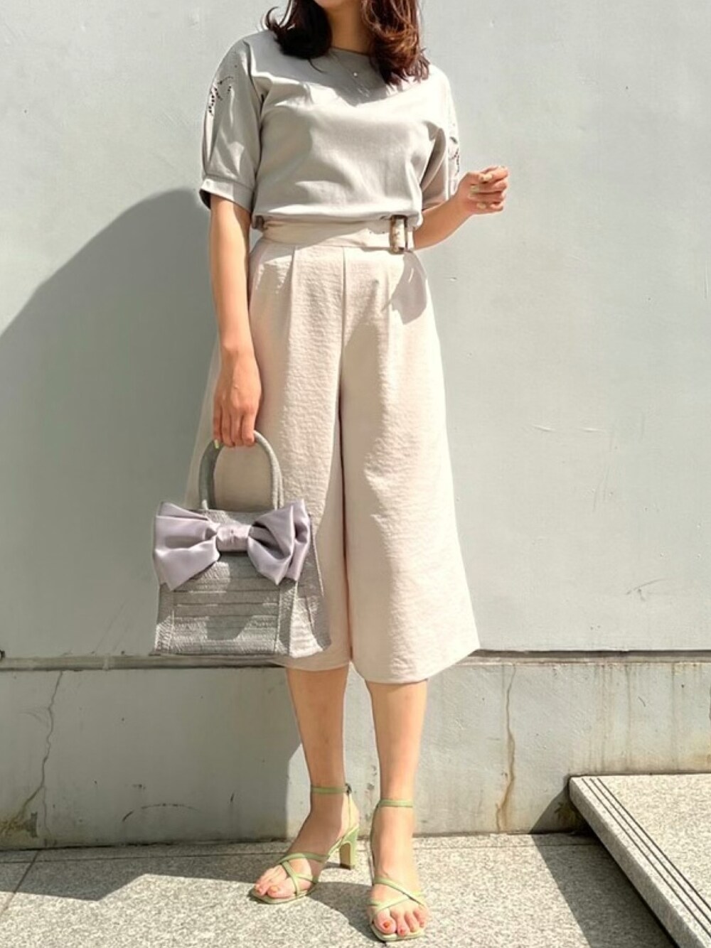 大人っぽくイエローカーキと 足元にさりげないコードサンダルでグリーンでリンクさせてトレンドのカラーを取り入れました♪ 大人っぽい上品コーデ!