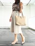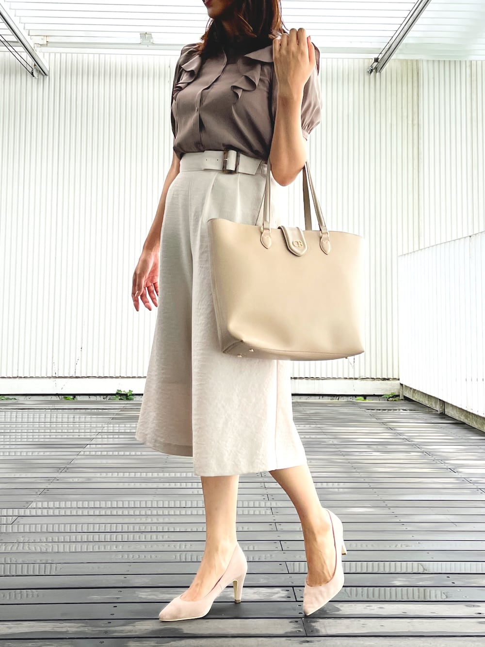オフィスコーデ! ブラウスはリボンがセットで、 付け方はマルチWAY!! お仕事スタイルなので今回はリボンは外しました! フリルが可愛いポイントで 全体はベージュ系でまとめて落ち着いた印象にしました!