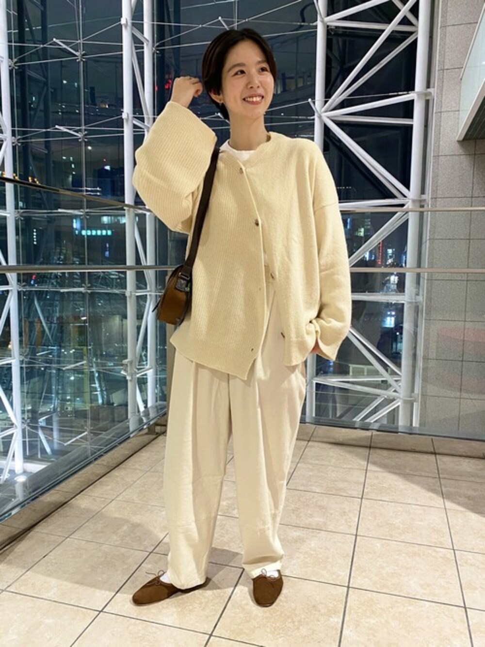 アイボリーのワントーンでも、ブラウンの小物で秋らしさをプラスできます。 ニットカーディガンも多数取り揃えております。 ぜひ店頭までお立ち寄りください。