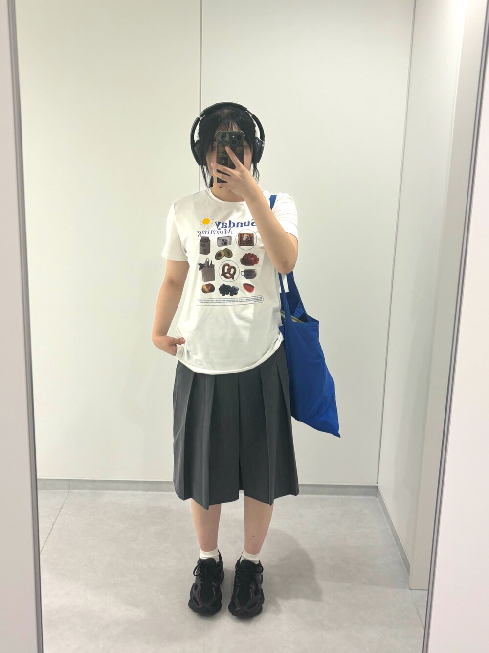 お友達とネオ居酒屋に行った時のコーデ❤️グレーのスカートは丈が膝下なので履きやすくスカート初心者にもおすすめ✨️青色のトートバッグで爽やかさをプラス🟦