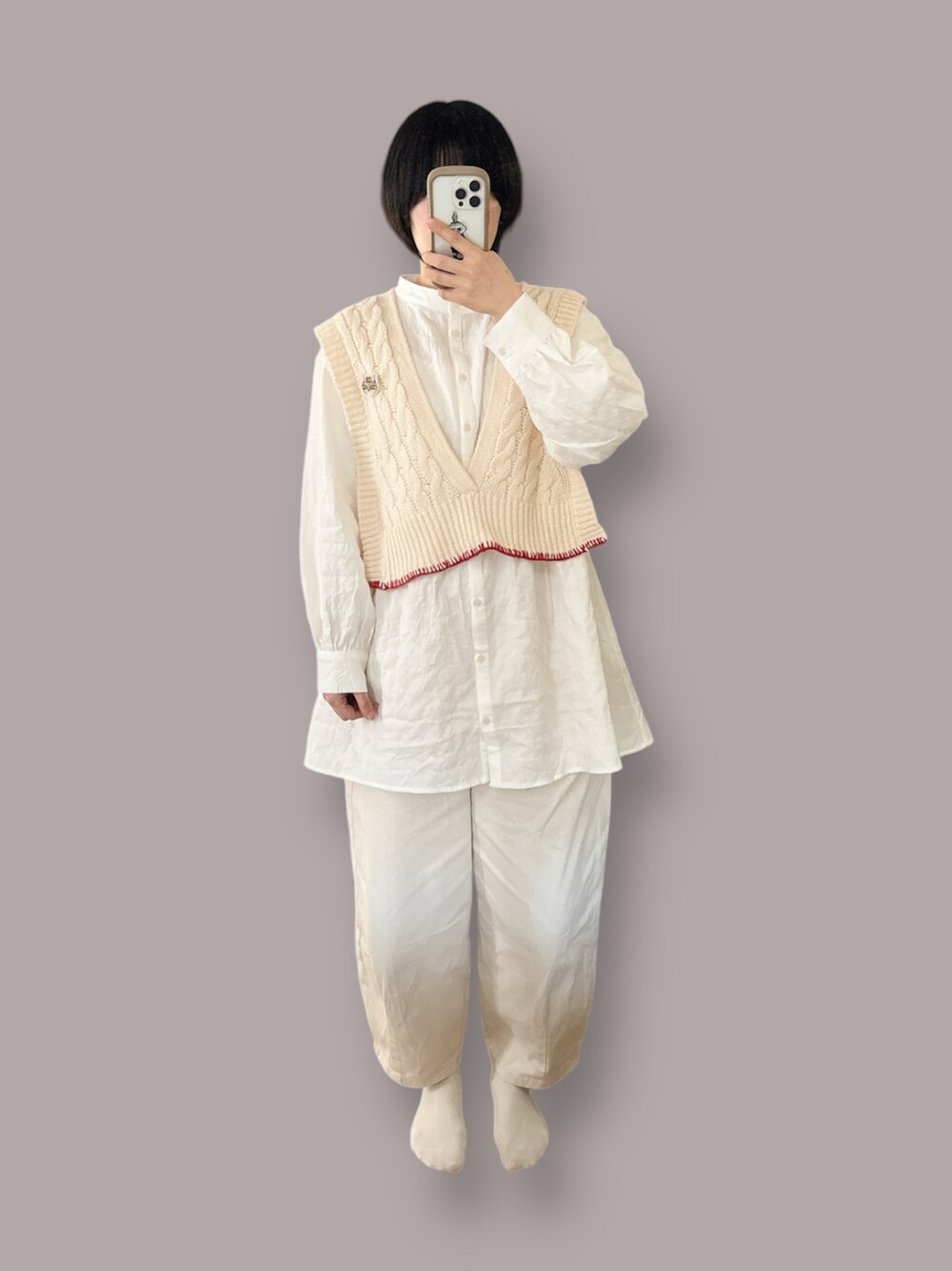 ホワイトのワンコーデでニットベストの赤縁と猫ブローチをアクセントに🐈