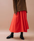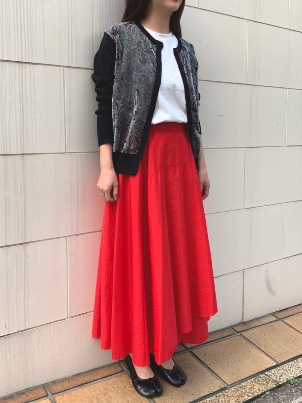 ◆赤スカートと秋カーディガン◆ ベロア地のオパール加工が施されてる大人の雰囲気なカーディガンと秋トレンドカラーの赤を差し色に、大人コーディネート