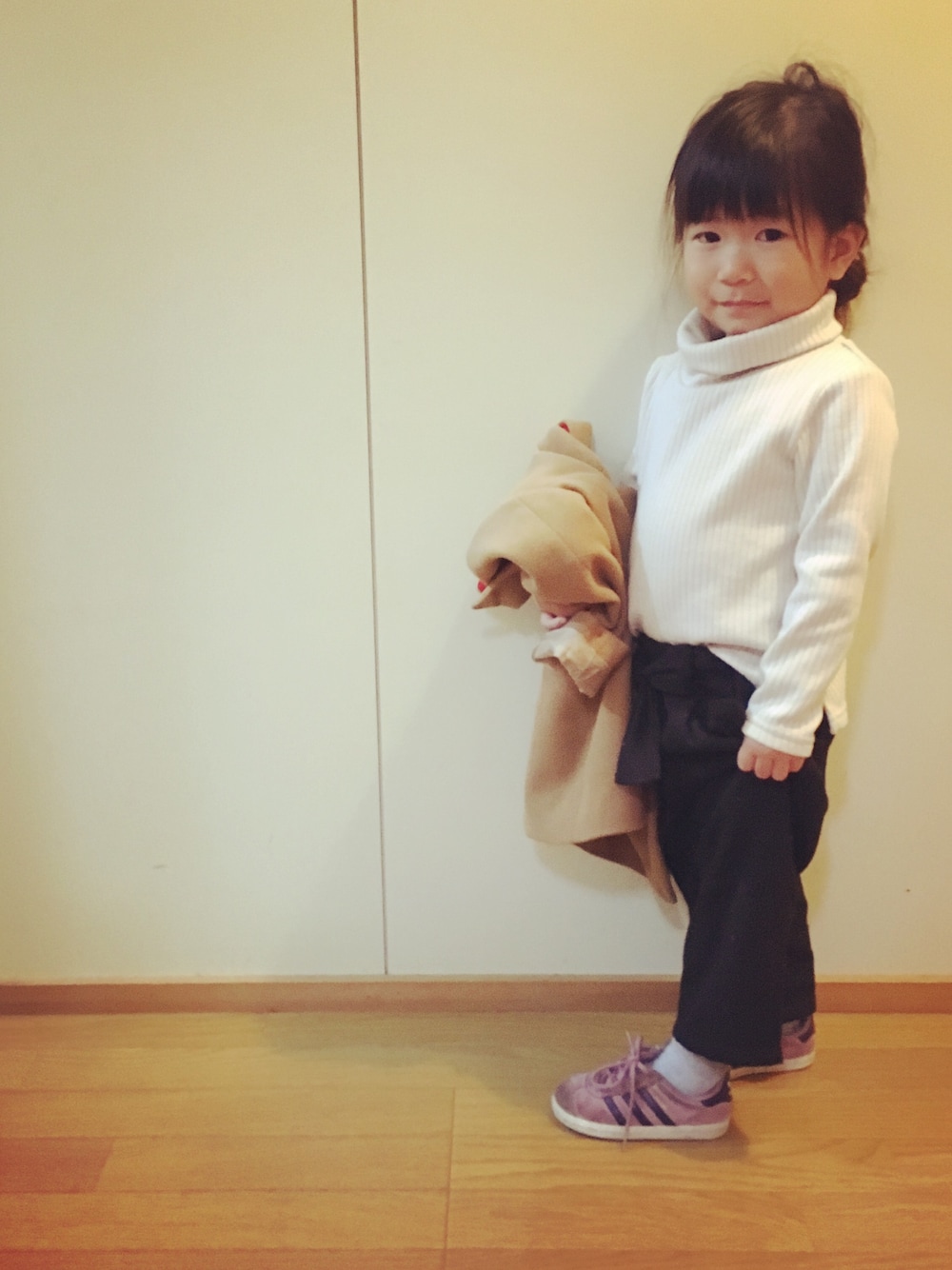 ハイネックニット 100 ゆるっと着れてちょーどいい🙆💕 パンツ 90 ピッタリサイズ🙆💕 100にしようか迷ったけど 細身な娘にはこれでよかった🙌✨ uuチェスターコート 100 袖1回折 丈感はちょーどいい🙆💕