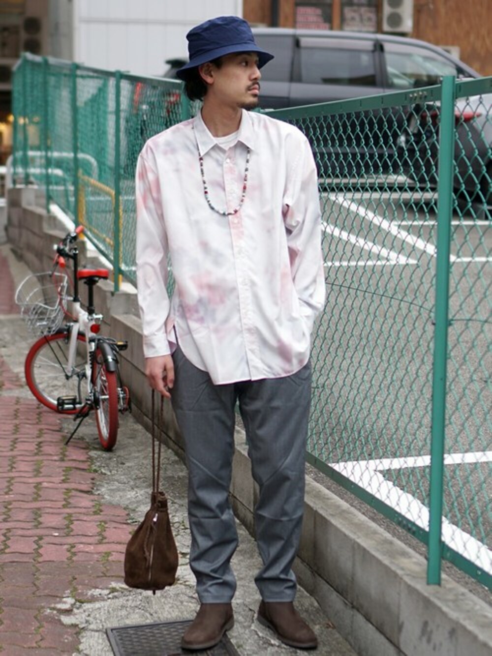 タイダイ柄のシャツをメインにしたコーディネート。シューズ・バッグに統一感を持たせることで、シャツの存在感をより一層引き立たせています。