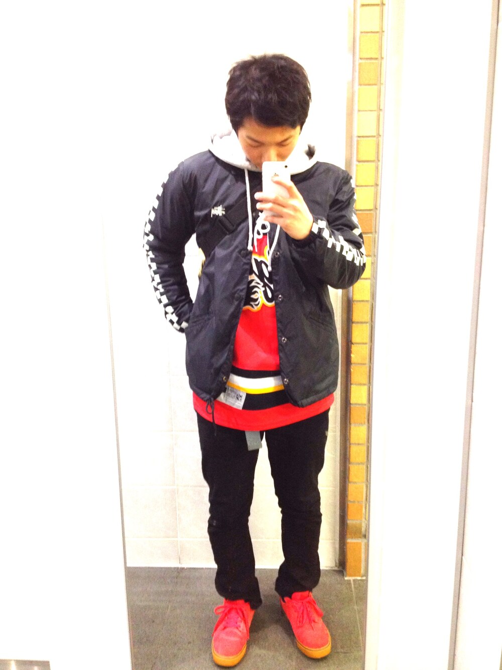 久しぶり更新! 最近スーツ三昧で私服久しぶりに着た^o^ 赤多めコーデ!あとは、アイスホッケーのシャツ着てます!スポーツMIX大好きです(^∇^) 本当はコーチジャケット着ないで全面に出したかったけど寒かったので仕方なく…笑 あとは、帽子も被りたかったな〜これの前にスーツきてたからワックスつけちゃっててね笑残念笑