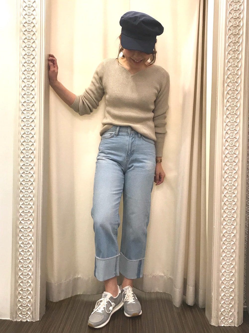 ブルーデニムが可愛すぎるっ ハートネックニットの女性らしさが、カジュアルを中和。