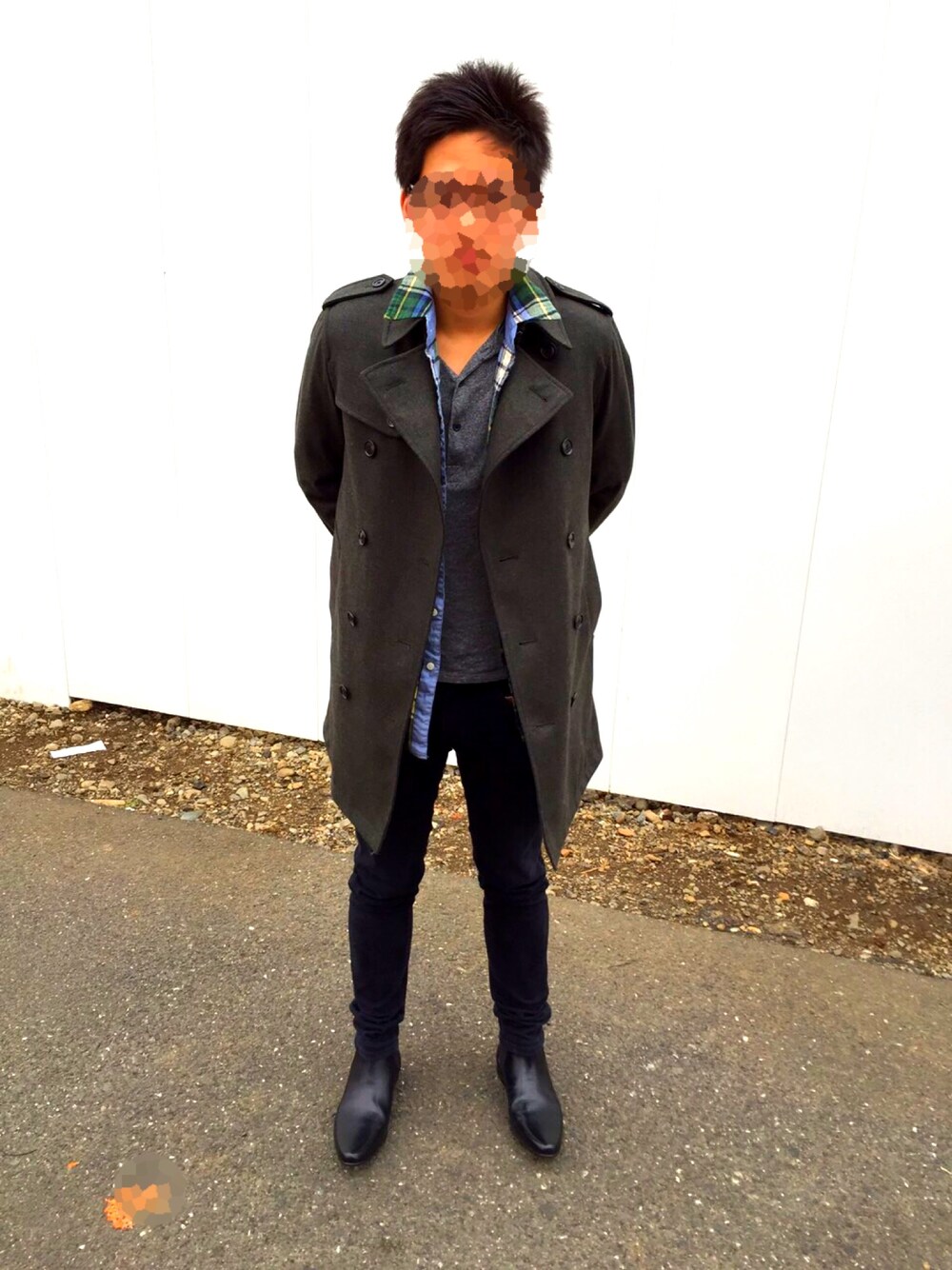 原宿にいってきましたー(^_^) まだまだ意外と寒いからコート着た^ ^ この暗い緑のトレンチコート結構お気に入り!! その下に同系色のチェック着てみました(^_^) 下はお気に入りのドクターデニムです! アドバイスお願いします!