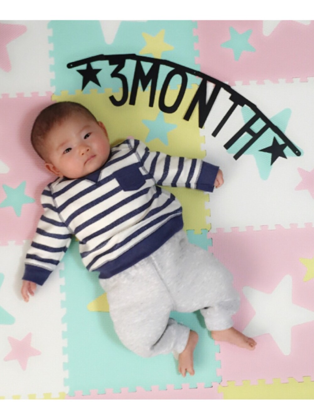 1日で3カ月になりました😝💕 記念にパシャり🎥 ベビー服はボーダーが多いですね