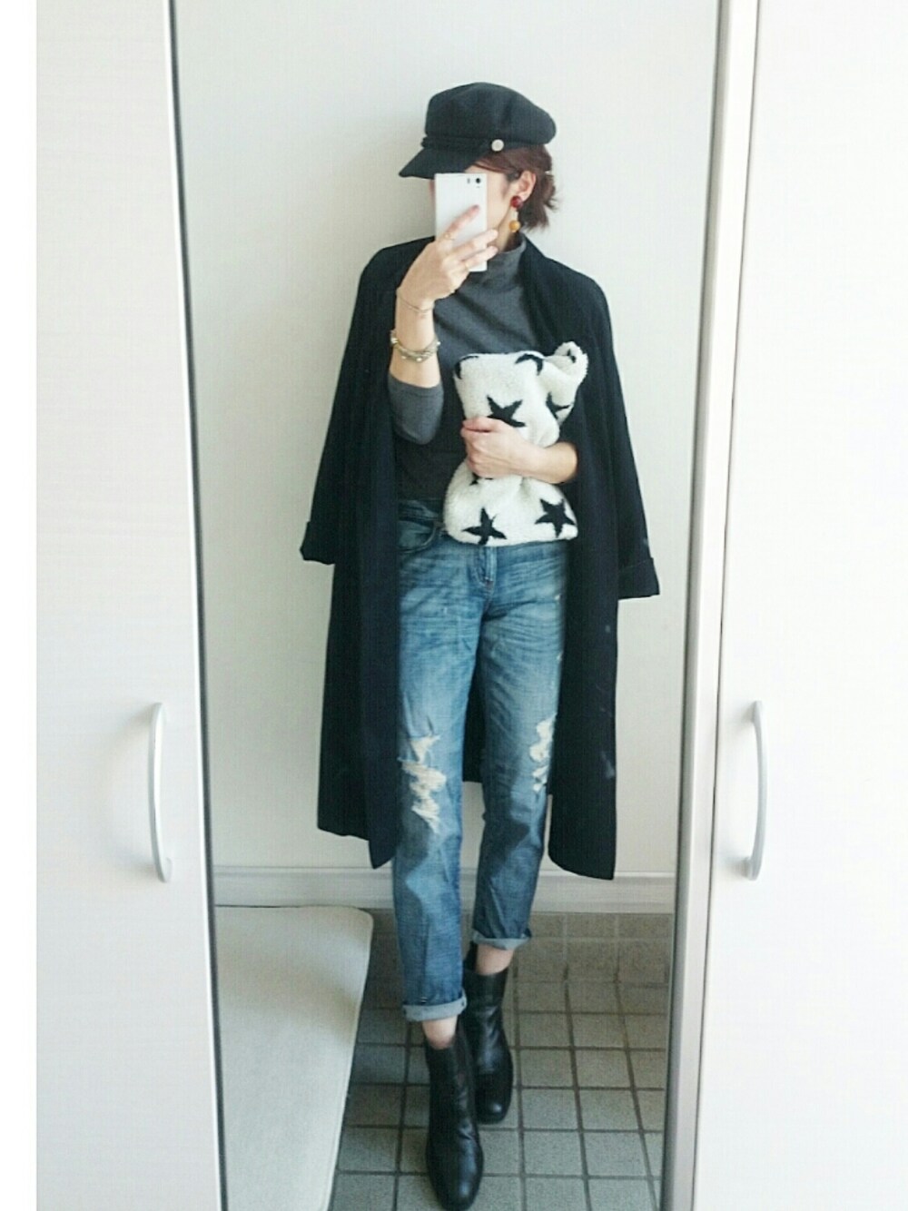 ブラック系のブーティ、ブラック系の帽子を着用したレディースの秋コーディネートの1枚目の写真