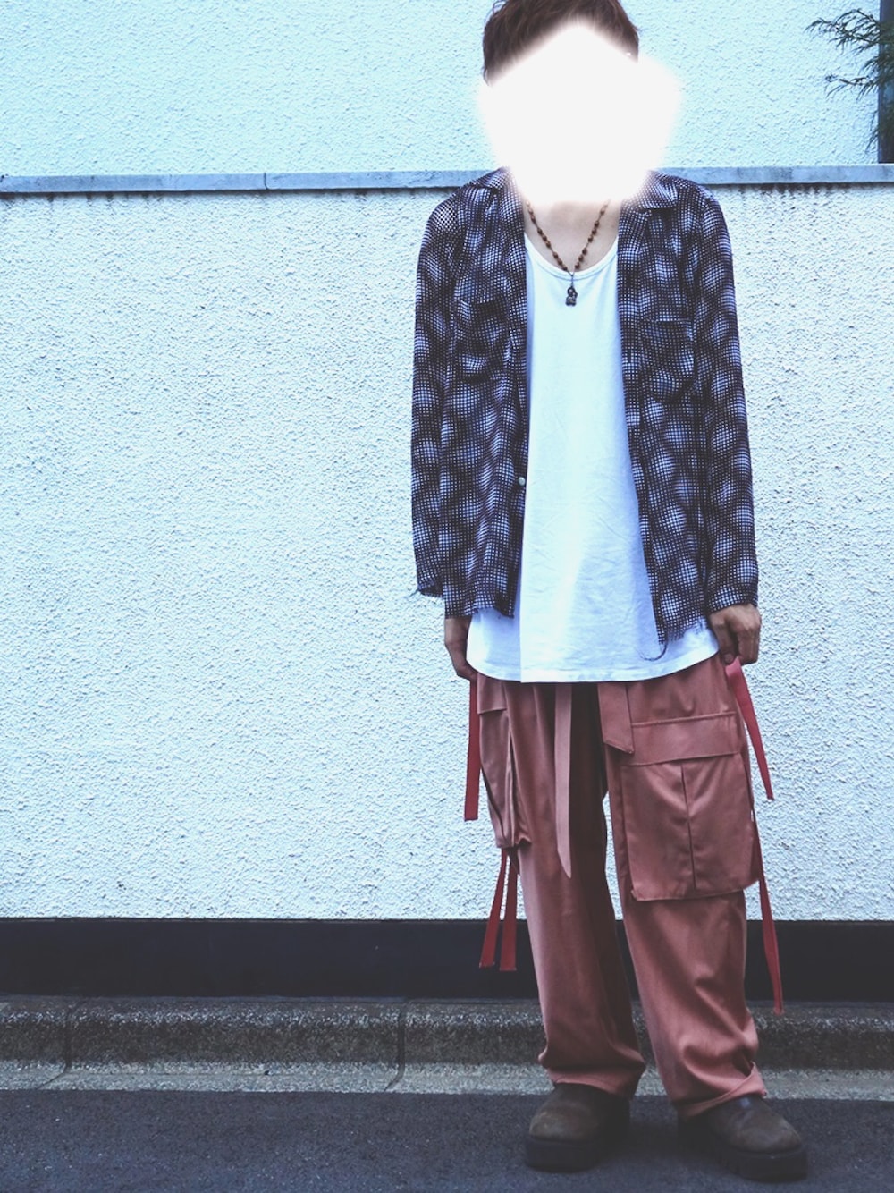 夕方とったから全体明るくしたけど、、 これが限界でした、、。 toironierのパンツで綺麗さを、、、 needlesのシャツで少し男臭さをだしてみました!! シャツは、透け感が強いのですが、ブラックなので馴染んでくれて便利です! アクセサリーはあまりつけないのですが、 ロザリオは個人的に絶妙なバランス感なのでたまに着けます、、、
