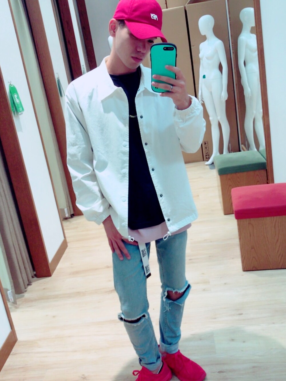 久々に更新です🎶 沖縄はまだ暑いですが😭 早く、寒くなってアウターや冬物が着たい!笑 白のコーチJKが珍しかったので即買い。笑 赤の差し色でまとめてみました🎶
