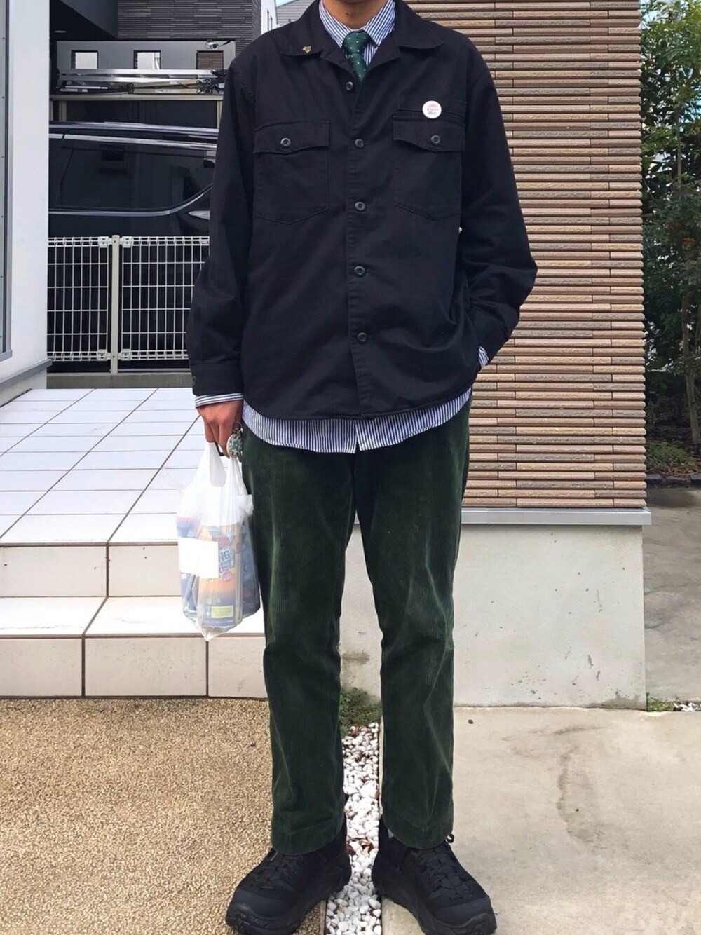 ネクタイとパンツをグリーンで合わせてみました。。 中に着ているストライプシャツとコーデュロイのパンツはどちらも古着のpolo
