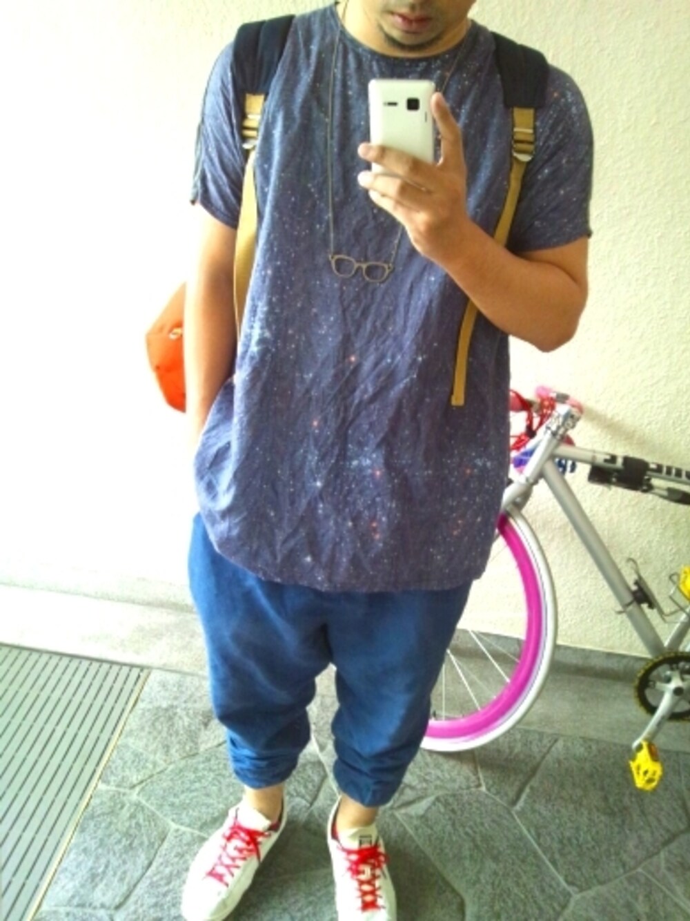 宇宙! 宇宙です。 コスモ。 セーター柄の上に宇宙柄のプリントです。 首のところが頭より小さいので 着る時、脱ぐ時破れやしないかとヒヤヒヤもんです。 靴は、ナイキのスターウォーズシリーズの、 なんか毛が生えてるやつです。