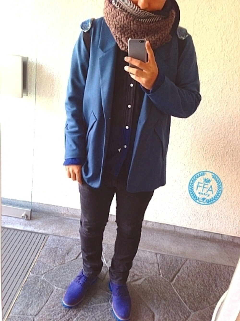 もっかい青ジャケ。 青ジャケ。 黒のスキニー? (あんまストレッチ効いてないからスリムかな?) のデニムに合わせてみた。 全体的に青多いな・・・ スヌードは、まだちょっと暑かったかも。