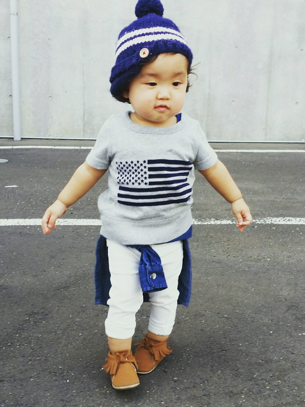 本日も プチプラ(´ロ`)♡ ■👕星条旗トップス…#babyGAP 1900円 ■👖白パン…#西松屋 1200円 👩女の子用👩 ■👗デニムシャツ…#OLDNAVY 2300円 ■👟くつ… OLDNAVY 1200円 👩女の子用👩 ■🎩ニット帽 …セレクトショップ 1500円