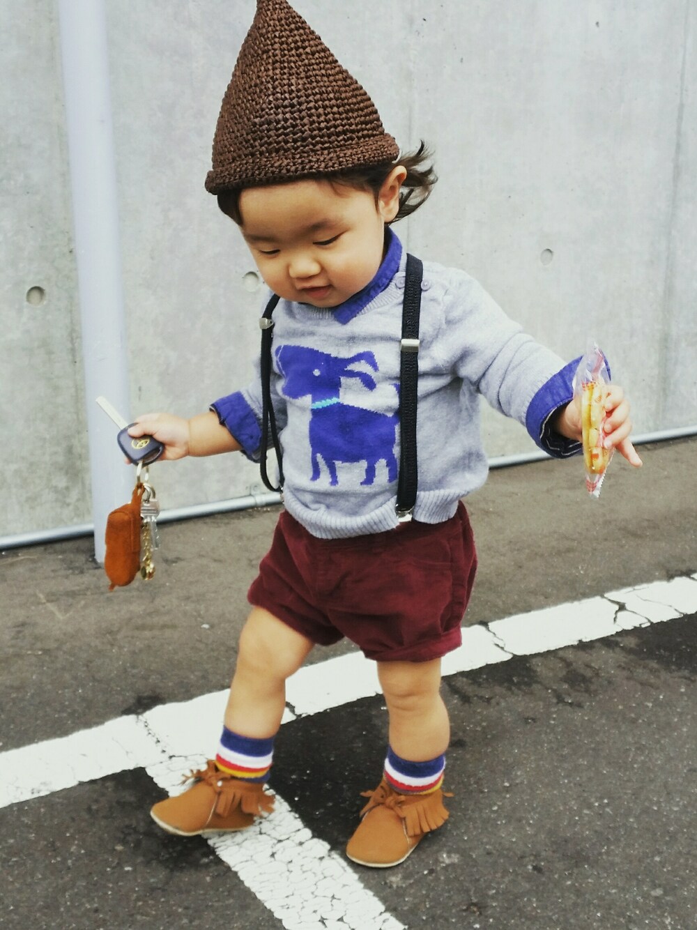 今日は、靴下で小人感アップ♡ 本日も プチプラ(´ロ`)♡ ■👕犬セーター…babyGAP 600円 ■👖あずきパンツ…OLDNAVY 1200円 👩女の子用👩 ■👗シャツ風ロンパース…HM 800円 ■👟くつ… OLDNAVY 1200円 ■🎩とんがり帽…オーダー 888円 ■👔サスペンダー…#ダイソー 100円 ■👢靴下…#西松屋