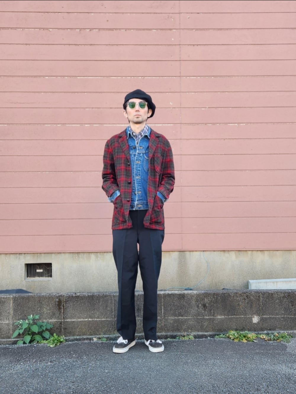 60s pendleton jacket 90s lee denim jacket 90s j.c.penney western shirt 80s us military trousers どんどん遠くなっていくスタイル (撮ってもらっているので強く言えないスタイル) 本当は革靴で合わせたい