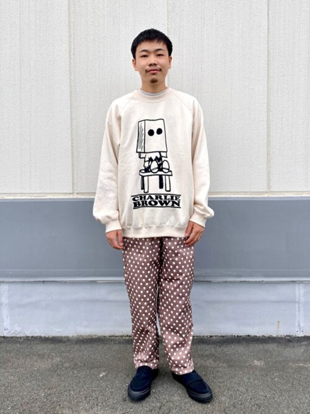 PEANUTS × SPORTS WEAR by JOURNAL STANDARD relume 人気のピーナッツコラボシリーズ20FWモデル 今回のコラボレーションは、王道の「チャーリー・ブラウン」をピックアップ。 紙袋を被った「MR. SACK(ミスターサック)」、年代の旧いチャーリー・ブラウン、後ろ向きの姿、と言ったなかなか御目に掛からないレアなカットを採用しました。 バックプリントは劇中で発したセリフから抜粋。 relumeの別注モデルでは、背面の文字フォントに2度同じものは使わずキャラクターのセリフにあったものを使用しており、今回もメッセージ性やインパクトに加えて、ユニセックスでお楽しみ頂けるような可愛らしさもある仕上がりです。 ボディには定番のモノトーンカラーで仕上げた「SPORTS WEAR by relume」の別注11.5オンスのクルーネックスウェットを採用。 肩はラグラン、アームホールは極太ディテール、時代感を捉えた計算されたオーバーサイズで女性がユニセックスで着用するのもオススメです。 キャラクター、色、スウェットデザインにおいて他のコラボレーションではあまり見かけないラインナップに仕上がりました。 身長:160センチ//普段サイズ:XS - XL//着用サイズ:M サイズ感:身幅はゆるめ、丈はスタンダード 素材感:裏毛で真冬も使える 着心地:柔らかくて軽い