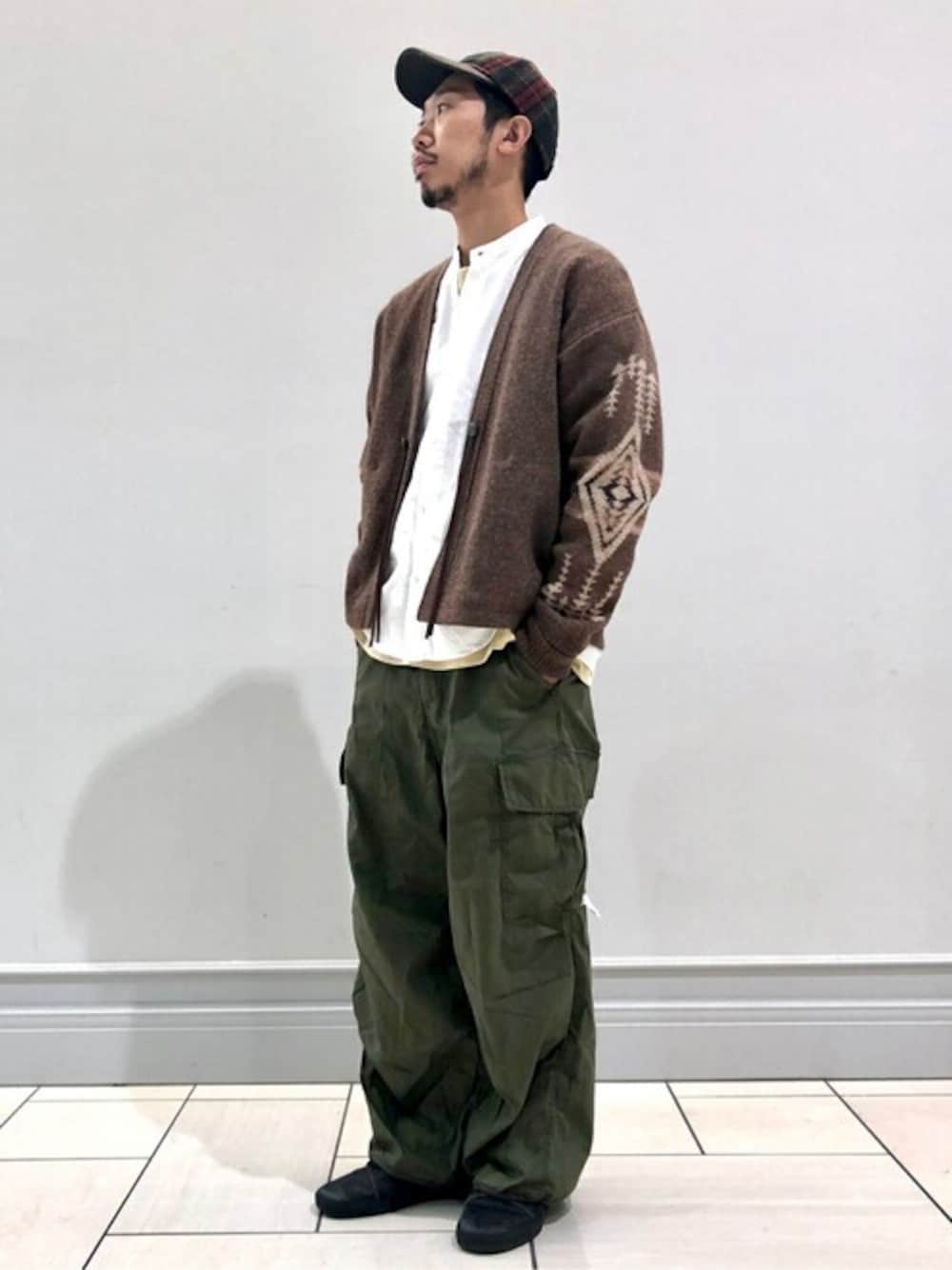 ●PENDLETON for JOURNAL STANDARD relume 別注カーディガン 身長:173㎝/体型:標準体型/普段サイズ:M〜 L 着用サイズ: M サイズ感: ちょうど良い。着丈が長くなりすぎないのでバランスがとりやすい。 素材感:ウール80%、ナイロン20%でしっかりした質感で型崩れを気にしないで使えそう 着用感:肩幅、身幅にゆとりがある為、ロンteeと厚手の起毛シャツで着ても窮屈感が無い。 ●バギー CARGOパンツ 身長:173㎝/体型:標準体型/体重64kg/普段サイズ:30〜32inch M〜 L 着用サイズ/M サイズ感:ゆったり。ウエスト紐でシルエットや丈感を調整出来る。 素材感:肌障りの良いコットン生地。やや薄手の為、冬はインナースパッツなどの使用をお勧め。 着心地:とにかく動きやすい。 ●着こなしポイント ペンドルトン のネイティブ柄とワイドシルエットのカーゴパンツの無骨さを引き立てる為に HOUSE HOLDの白無地バンドカラーシャツを取り入れる事で大人カジュアルに寄せてコーディネート。 ベーシックでシンプルな合わせだけどカーディガンの存在感があってこその着こなし。 カーディガンは大胆な柄を採用しながらもこちらのrelume別注なら主張し過ぎず飽きずにお使い頂けます!