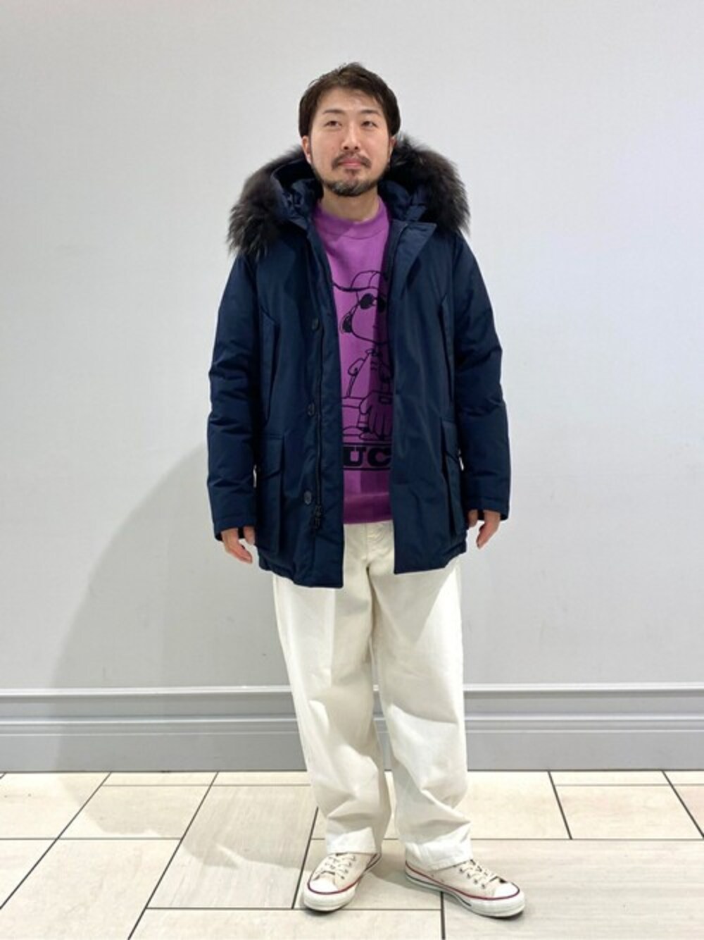 TOPS:【WOOLRICH×relume / ウールリッチ】別注 NEW ARCTIC PARKA 身長:170㎝/普段サイズ:M〜L 着用サイズ:M サイズ感:ややゆったり 素材感:サラッとしていて光沢を抑えた素材感 着心地:軽くて羽織りやすい。暖かさは間違いないです。ファーやボタンが暗いカラーなのでビジネスシーンにも使いやすくなってます。 PANTS:【PICCADILLY for relume/ピカデリー】別注 5600 BAGGY デニム 身長:170㎝/普段サイズ:M〜L 着用サイズ:M サイズ感:ワイドシルエット 素材感:地厚でしっかり 着心地:程良くワイドでとても履きやすい。デニム地なのでガシガシ使えます。