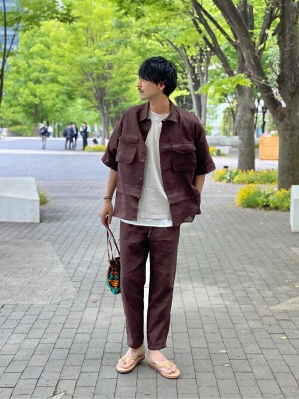 ''真夏も快適な着心地◎大人のリネンセットアップ''Style Sample.. 上質なフランダースリネンを贅沢に使った真夏対応出来るセットアップ◎ フランス、ベルギー、オランダにまたがるフランダース地方で栽培された最高品質のリネン。 吸水性と速乾性に優れ、柔らかさが特徴。 使っていく程に身体に馴染みやく、幅広いスタリングにマッチ。 リネン素材ですが、ご家庭での洗濯が可能でイージーケア性に優れています。 《デザイン》 ゆとりのある身幅は一枚でも、重ね着してもリラックスしたシルエットに。 トレンドのボックスシルエットで、Tシャツや薄手のスウェットなどインナー問わずスタイリッシュに着回す事が出来ます。 両胸には大きめの二段ポケット、左側にはストラップがついたりとディテールにもこだわっております。 絶妙に重過ぎないコックリしたブラウンは今季かなりオススメです◎ ユニセックス対応で女性の方が緩めに着用しても抜群にお洒落な雰囲気です。 【実際に着用して感じたオススメポイント】 ◉計算されたオーバーサイズながら丈感も長過ぎず、使いやすい◎ ◉ユニセックス対応として女性の方は勿論、今時期から春先の本命アイテムとして、カップル&ご夫婦兼用で使用も◎ 身長: 182cm / 72kg 普段のサイズ: L〜XL 着用サイズ: TEE→XL INNER→L PANTS→M SHOES→L