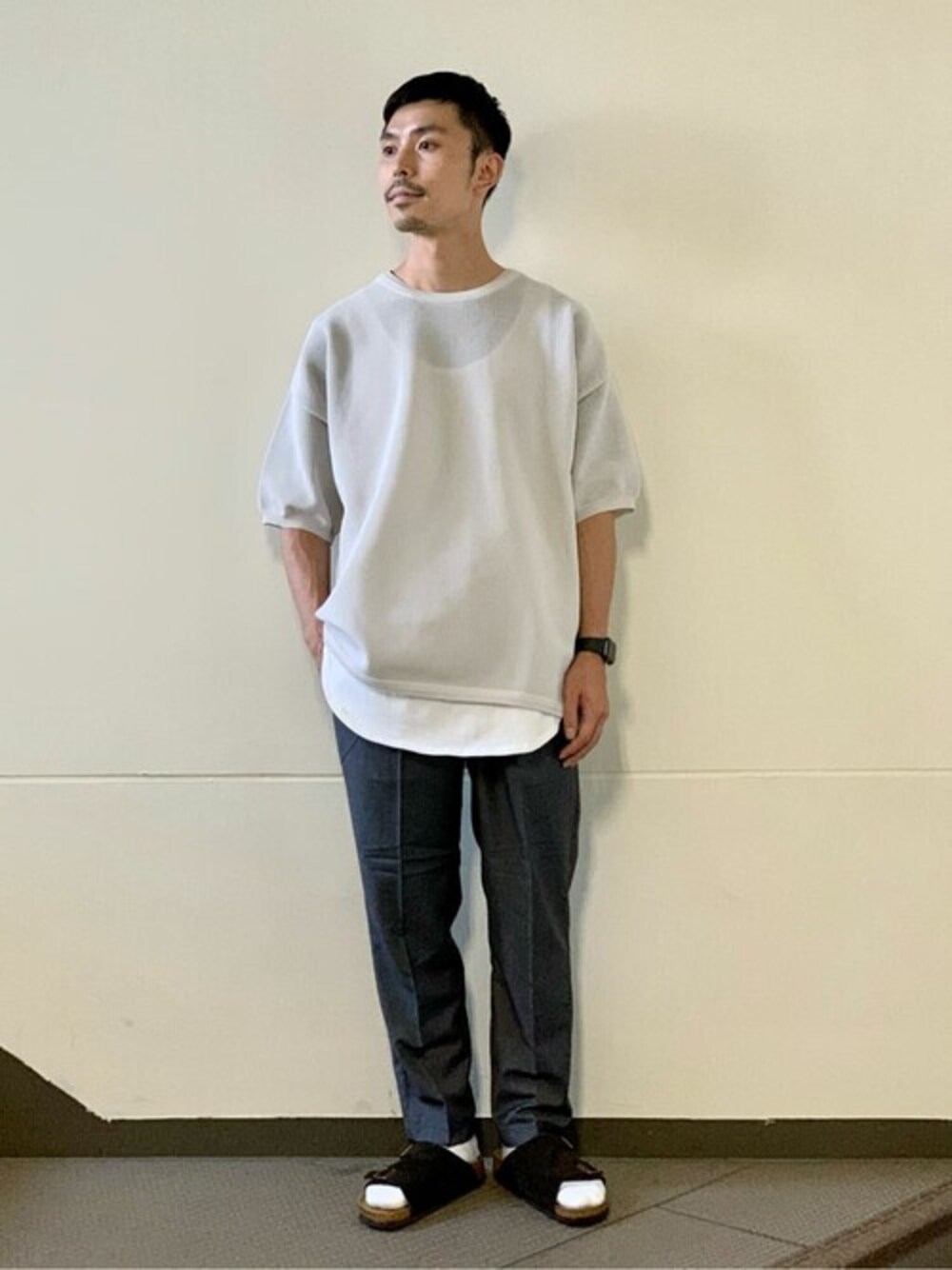 夏の新定番"ニットTee"で涼しく着る! 普通のTシャツ一枚に飽きた方には、今年はニットTはどうでしょうか? 個人的には、この手のタイプは汗染みが全く目立たないうえに、風通しの良いサラッとした質感がポイントですよ! そしてウールと違ってポリエステル素材なので自宅で洗えるのも有り難いところ! まだまだ続く暑い夏のコーディネートにも 変化を取り入れやすいアイテムなのでぜひトライしてみては!? 綺麗な印象もあるので、スラックス等と合わせても纏まりますよ! 【半袖ニット+カットソー2点SET 】リサイクルポリエステル半袖ニット 身長:165cm / 体重:58kg / 普段サイズ:S / 着用サイズ:M サイズ感:身幅広め。肩も落ち感あり 素材感:サラッとした風通しの良い質感 着心地: 軽くて、ゆったりしているので非常に楽 【RE】スラックスイージーパンツ 身長:165cm / 体重:58kg / 普段サイズ:S / 着用サイズ:M サイズ感:ややスッキリとしたシルエットに程良いテーパード。レングスは9分丈で綺麗に履けます 素材感:薄手でサラッとした質感。やや光沢あり 着心地: ウエストもイージー仕様でストレスフリーな着用感。生地も薄手で風通し◎です!