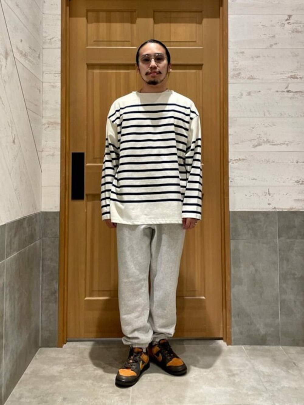 3XL NAVAL BORDER/ボーダーTシャツ 今期トレンドにもなっている”ボーダーTシャツ”の秋冬モデルです。 大きめサイズが主流の今、relumeではサイズ感に特徴を持たせ今っぽいデザインとシルエットにしています。 2サイズ展開で特に3XLサイズは身幅を広く取られており、短丈・幅広の正方形に近いボックスシルエットに仕上げました。 そうすることで幅広いスタイリングに対応することができ、レイヤードスタイルなども楽しむことができます。 生地感は空気の力で撚り合わせる空紡糸で編みたてた生地を使用しています。 表面の撚りが強い為、表はしっかり、中心にいくほど撚りは甘く柔らかいのが特徴で、relumeが開発したオリジナルの生地です。 ********************* 身長:165cm/普段サイズ:M/着用サイズ: L サイズ感: 身幅が広く、丈が短めなのでオーバーサイズだが、だらしなく見えないサイズ感が良い◎ 素材感:生地感はさらっとしていて、柔らかい素材感です。 着心地:袖や裾などにリブが無いのでゆったりとリラックスして着ることができます。