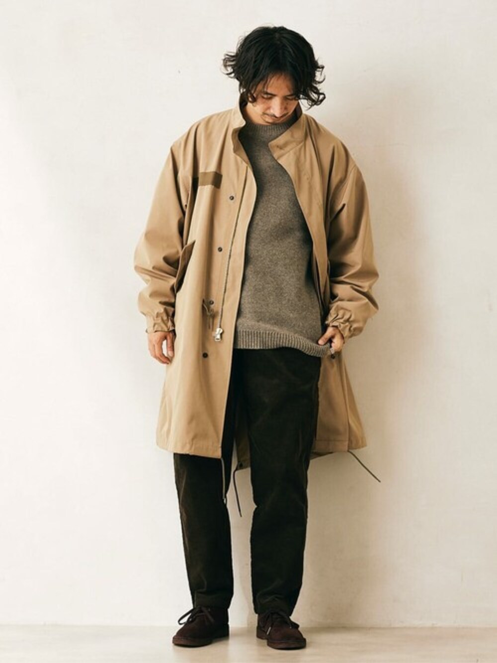 CALIFORNIA MODS COAT 年齢:30代 身長:174cm 体型:標準型 ********************* ▼アイテム別紹介 COAT CALIFORNIA モッズコート ¥16,500税込 着用サイズ:L サイズ感:ビッグシルエットのモッズコート。普段のサイズでも充分大きめです。 素材感:ハリコシもあり少しの雨でも◎軽くて羽織りやすい素材。 コメント:素材も軽く楽に羽織れます。女性の方が大きめに着ても◎ ーーーーーーーーーーーーーーーーーーーーーーーーーーーーーーーーーーーー KNIT HAMILTON W100% GATER クルーネックニット ¥10,780税込 着用サイズ:L サイズ感:肩周りはゆったり、身幅はインナーにシャツが着れるぐらい程よくゆとりがありオーバーサイズ過ぎないシルエット。 素材感:チクチク感の少ない柔らかく暖かいウール素材。 コメント:カラーバリエーションも豊富で着心地がいいニット。 ーーーーーーーーーーーーーーーーーーーーーーーーーーーーーーーーーーーー PANTS CALIFORNIA コーデュロイ シェフパンツ ¥6,380税込 着用サイズ:L サイズ感:ゆったり履けるテーパードシルエット。スッキリ履きたい方は普段のサイズよりワンサイズ下げても◎ 素材感:細い畝のコーデュロイ素材。保温性もあり柔らかく履き馴染みがいいです。 コメント: ウエストゴムが楽。履く腰位置でシルエットも変わりますので、トップスに合わせてシルエットも変えられる万能パンツ。 ▼一言コメント 新色のベージュはブラウン系の相性も良く秋コーデにピッタリ。