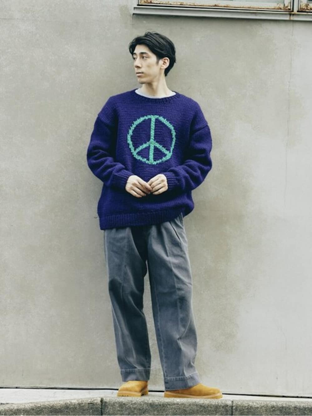 体型:標準型 普段着用サイズ:L 年齢:20代 毎年ご好評頂いているTHRIFTY LOOK のHand Knitシリーズから新作ピースマークニットが登場。 キャッチーなニットをメインに褪せたプリーツ入りのデニムを合わせた大人ストリートコーデです。 《ニット》 着用サイズ:L 着用サイズ感:ゆったりとしたサイズ感で、1枚でサマになるサイズ感です。 《デニムパンツ》 着用サイズ:L 着用サイズ感:ワイドなシルエットで、ウエストもゴムで楽な履き心地。