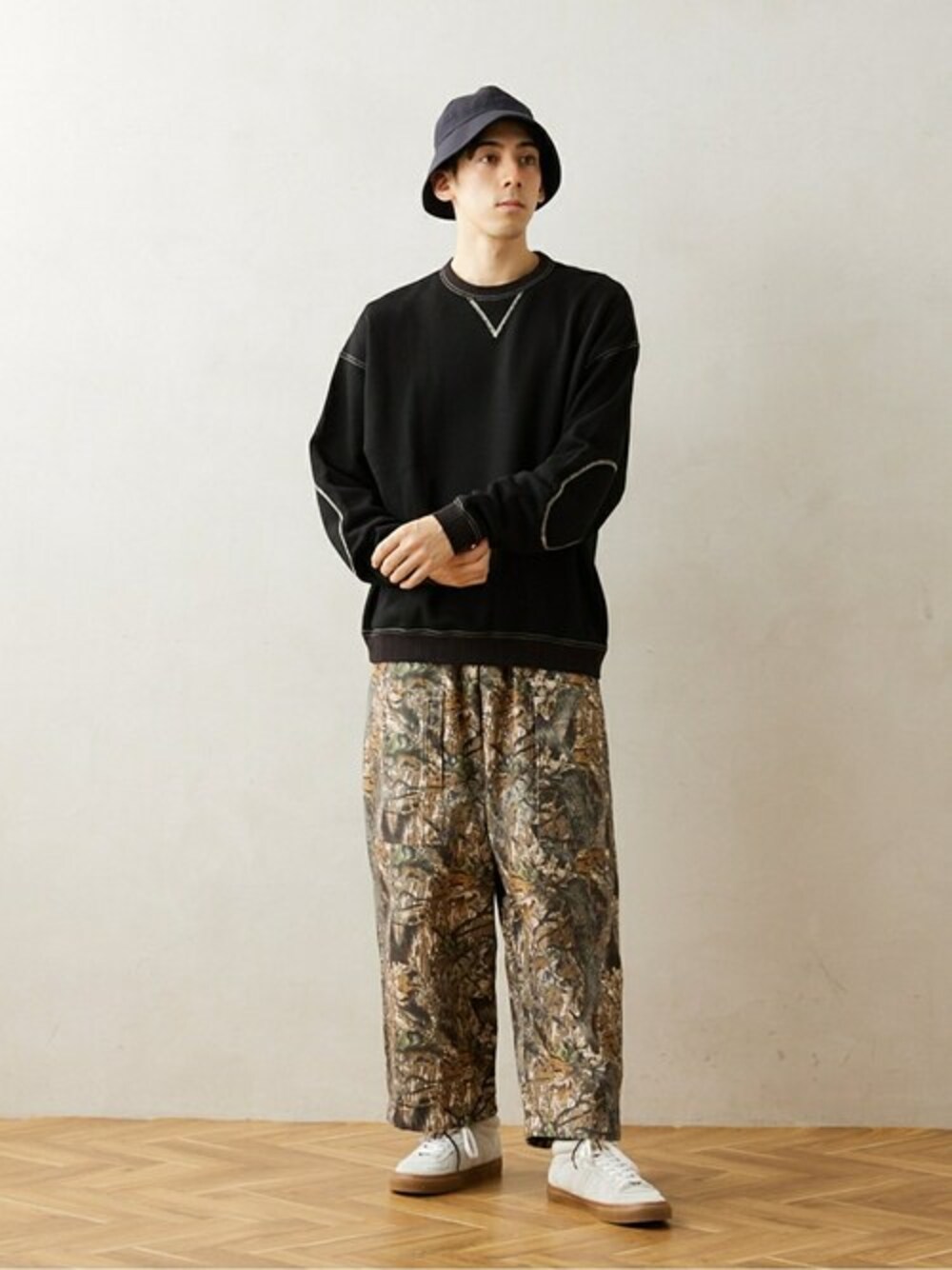 身長:179cm 体型:標準型 普段着用サイズ:L 年齢:20代 ゆったりした身幅でオーバーサイズなクルーネックスウェット。 カモフラ柄のパンツとハットに合わせたストリートスタイルです。 《スウェット》 着用サイズ:L 着用サイズ感:ゆったりしたオーバーなサイズ感。