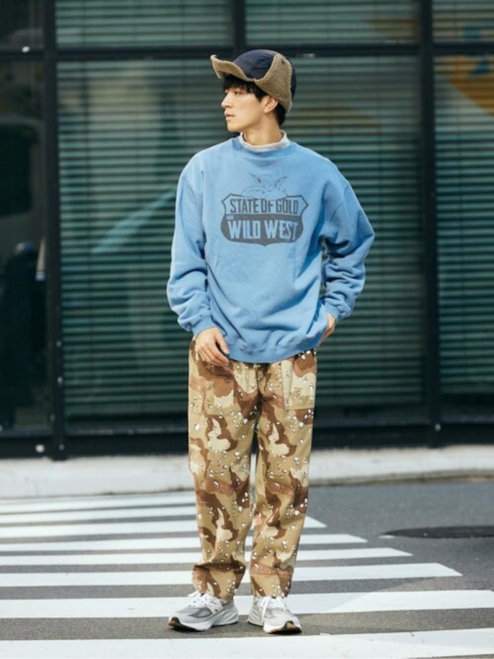 身長:176cm 体型:標準型 普段着用サイズ:L 年齢:30代 「NATION BRANKS / ネーションブランクス」からオリジナルプリントをデザインしたクルーネックスウェットが登場! ポップなスウェットにカモフラ柄のパンツとフライトキャップで遊び心をさらにプラス。 ブルーの色味も古着っぽいのでカモフラ柄のパンツと相性◎ 《スウェット》 着用サイズ:L 着用サイズ感:ゆったりめのオーバーサイズシルエット。 《カーゴパンツ》 着用サイズ:L 着用サイズ感:太もも辺りはかなりゆったりとしています。