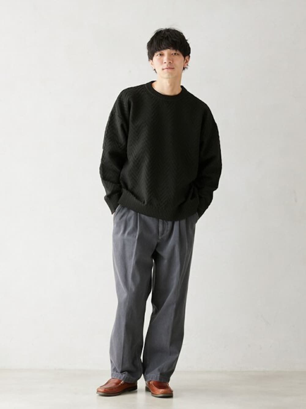 身長:176cm 体型:標準型 普段着用サイズ:L 年齢:30代 大人気の”洗えるニット&カットソー”シリーズに今回も新型ニットが登場! ニット×デニムのオールブラックでまとめました。 シンプルでカジュアルなので足元は革靴できれいめ要素をプラスしました。 《ニット》 着用サイズ:L 着用サイズ感:ややゆったりとしたオーバーなサイズ感です 《デニムパンツ》 着用サイズ:L 着用サイズ感:腰回りにはゆとりがあって快適なサイズ感です。