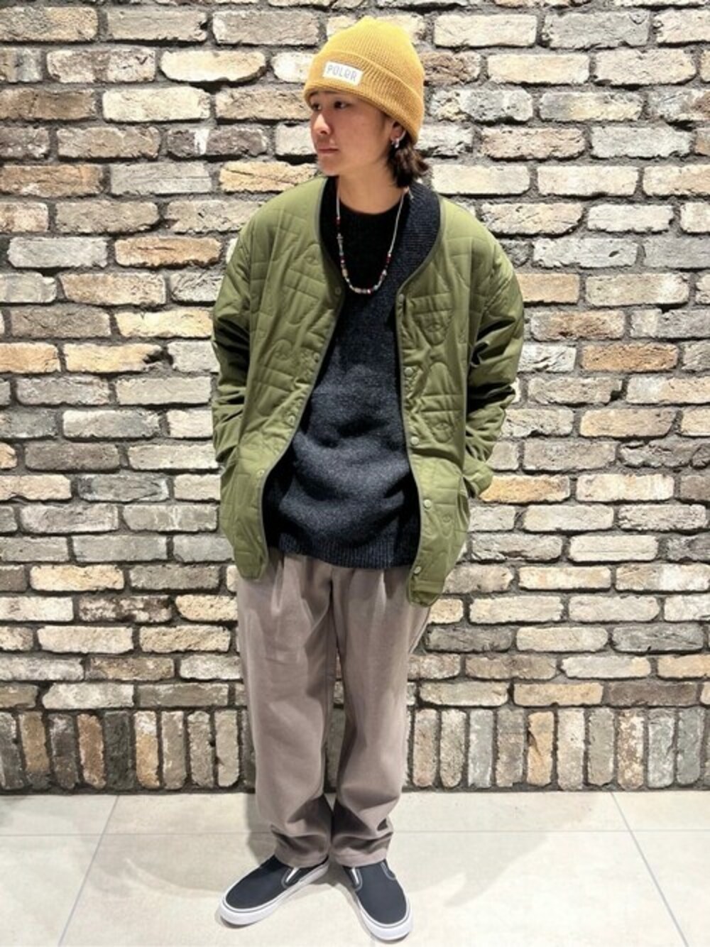 POLeR 別注 CYCLOPS キルトジャケット サイズ感: ゆとりあり 素材感: 中綿が入っていて暖かい 着心地: 見た目以上に軽く 着心地抜群 HAMILTON WOOL ガーター クルーネックニット サイズ感: ゆとりあり 素材感: ファーモデルよりもしっかりとした素材感。 着心地: ふんわりとしていて、柔らかく◎ TECH WOOL ヘビーウォッシャブルパンツ サイズ感: ゆとりあり 素材感: 立体感があり無地でもシンプルになりすぎない 着心地: 肉厚で肌触りの良い着心地 一言コメント パンツとトップスのみでは少し肌寒い日にオススメのコーディネートです! カーキーを入れることにより色味使いも気にしてみました!^^ 全体的に今風のゆとりもあり、また素材感もマット素材の物が多いためオススメです!
